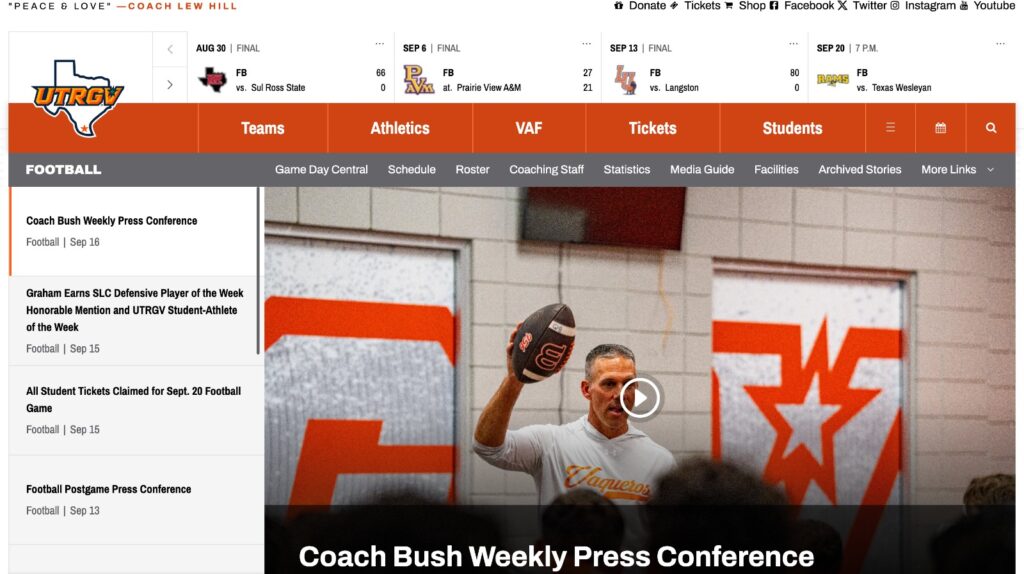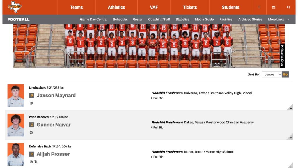 Un aspecto fundamental de la FCS es su transparencia y visibilidad digital. Para verlo en acción basta con entrar al sitio web de los UT Rio Grande Valley Vaqueros, el nuevo programa de Brownsville, Texas, que incluso mantiene una relación cercana con Borregos Monterrey (se llegó a rumorar un scrimmage entre ambos). Al navegar en su página encontramos una presentación impecable de su roster: cada jugador aparece con foto oficial, peso, altura, año de elegibilidad, redes sociales, preparatoria de origen y lugar de nacimiento. Es como abrir un media guide completo en línea, algo que en México pocas veces se ofrece. Un ejemplo aislado fue el esfuerzo de Borregos Monterrey al presentar una media guide en 2025.
