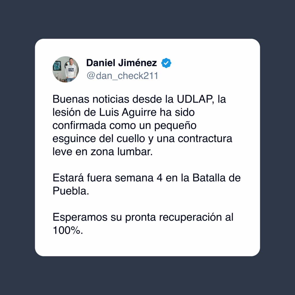 El «Cemita Bowl» de este fin de semana entre los Aztecas UDLAP y los Borregos Puebla tendrá una baja significativa. A través de X, Daniel Jiménez confirmó que el ex cinco estrellas y mariscal de campo titular, Luis Aguirre, sufrió una lesión que lo dejará fuera del enfrentamiento.